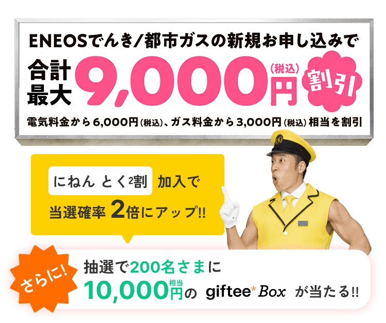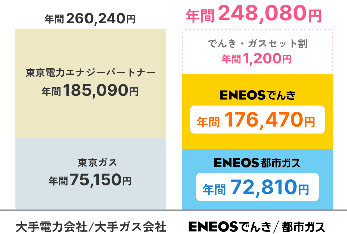 電気代・ガス代がおトクになるんです※ご使用状況やご契約内容によっておトクにならない場合がございます ※おトク額には燃料費調整額・再生可能エネルギー発電促進賦課金は含まれておりません ※東京電力エナジーパートナー(株)「従量電灯B」とENEOSでんきの「東京Vプラン」(にねん とく²割を含む)の年間電気料金の比較です ※当社独自の前提による試算で金額は参考目安(税込)です。契約アンペア数は40Aで算出しております。平均月間電気使用量は4人家族の場合を想定し400kWhで算出しております ※ENEOS都市ガスは東京ガス(株)供給エリアのうち、「東京地区等」と規定しているエリアにお住いの方、京葉ガス(株)の供給エリアにお住いの方が対象です。またプロパンガスは対象外です ※ガス料金のおトク額はENEOS都市ガス 標準プラン(TK)ご契約の場合で、東京ガス(株)の一般料金の年間ガス料金との比較です ※ガス使用量は4人家族の場合を想定し40㎥で算出しております ※口座振替割引等の各種割引は含まれておりません ※ENEOSでんき・ガスセット割を含み、適用条件がございます ※当社独自の前提による試算で、金額は参考目安(税込)です ※2026年01月時点